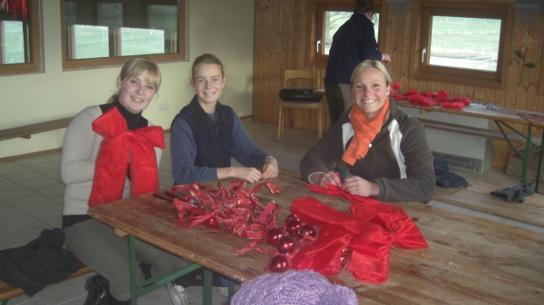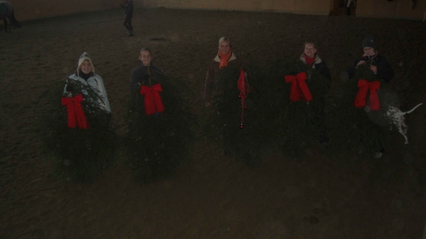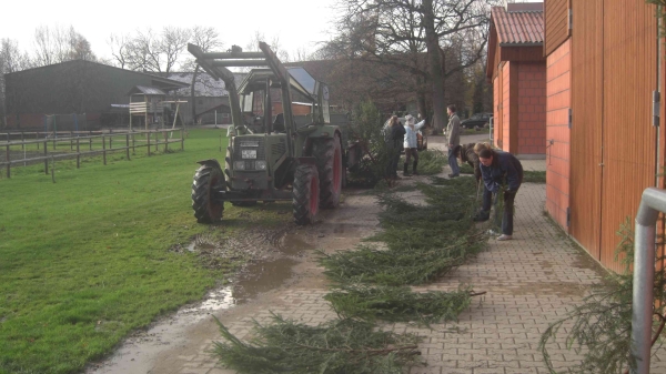 Heute haben wir die Reithalle weihnachtlich geschmückt. Hinterher gab es reichlich Glühwein im Casino. Zuerst mit dem Traktor die Äste rangefahren....